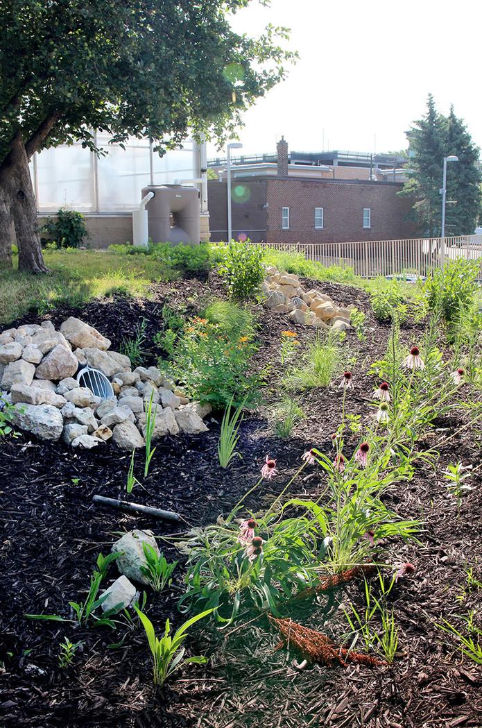- Stormwater reuse and native site plantings reduce water needs and costs