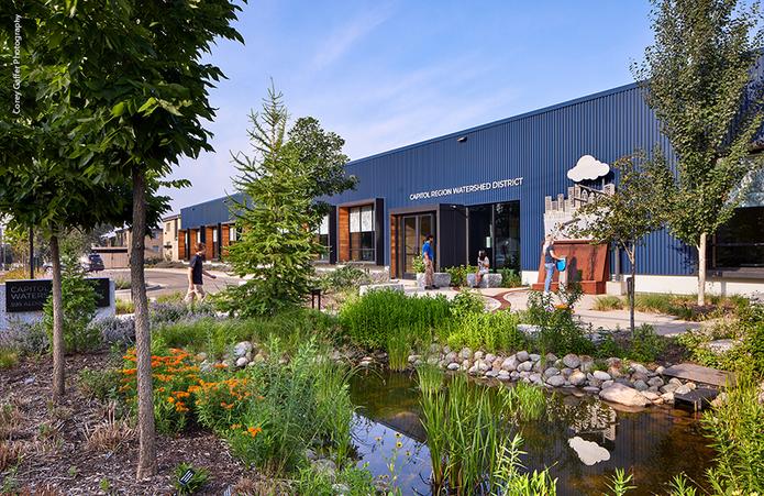 EOR, in collaboration with MSR Design, transformed an industrial building into the new office and campus of the Capitol Region Watershed District (CRWD). EOR implemented the most advanced stormwater management technologies across the campus to both manage stormwater on-site and to convey the mission of the CRWD. EOR established multiple, unique gathering areas across the campus, including a community "pocket park," an outdoor classroom nestled within a constructed wetland, and an employee patio for both staff use and public events. Each of these areas is interwoven with accessible stormwater management BMPs such as permeable pavements, tree trenches, and bioretention basins. The site also features educational and artistic elements, such as sculptural downspouts that deliver roof runoff to surface BMPs and an interpretive exhibit powered by harvested runoff from the interior cistern.